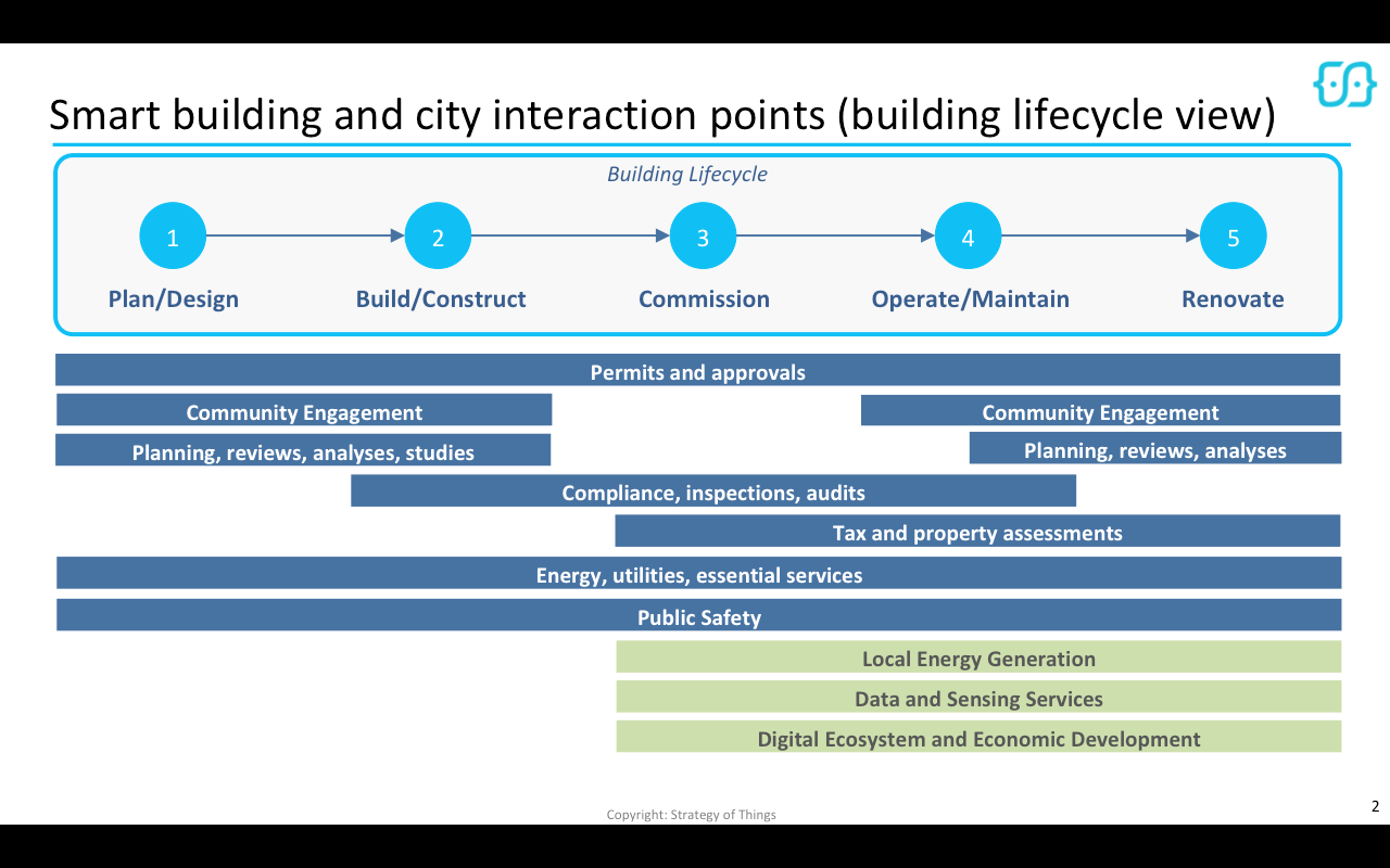 Figure Five identifies the major interaction points between the smart building and the city over a typical building life cycle[3]. At each stage of the building life cycle, a different set of activities, and interactions, are involved between the smart building, the city, and others in the civic ecosystem. Some of these interactions are identical to those that exist between the city and traditional buildings. However, smart buildings provide additional interactions (highlighted in green), enabled by their advanced energy and digital infrastructures and capabilities. These interactions create new opportunities for value to the city.