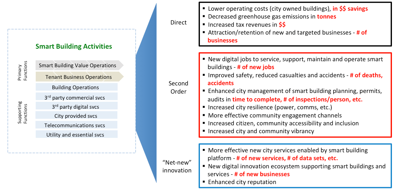 - The value created for cities by smart building fall into three categories – direct, indirect and innovation. Direct benefits are those benefits that arise as a direct consequence of implementing a program or delivering a service in creating a civic outcome. Indirect benefits are those that arise from a secondary consequence of implementing a program or delivering a service. Indirect benefits are those that arise from a secondary consequence of implementing a program or delivering a service.