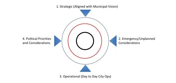 The political dimension considers how the outcomes and benefits are aligned with the long term and day-to-day electoral, governance and legislative needs of the city. It reflects the priorities of the political leaders and the citizens who elected them. These priorities may not always align with the city’s strategic and operational priorities. At other times, they may be consistent with the city’s strategic priorities, but not aligned on when they should be implemented. These priorities are typically documented in the campaign platform or promises that political leaders got elected on, and addresses the specific needs of their constituents.