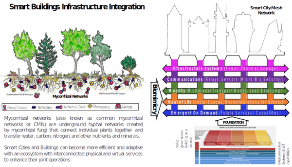 Similarly, applying biomimicry and leveraging nature’s millions of years of design evolution, an integrated mesh network across buildings allows them individually and, on the city/community level, to generate and take advantage of combined infrastructure and meta behaviors #Figure: Mycorrhizal Network.