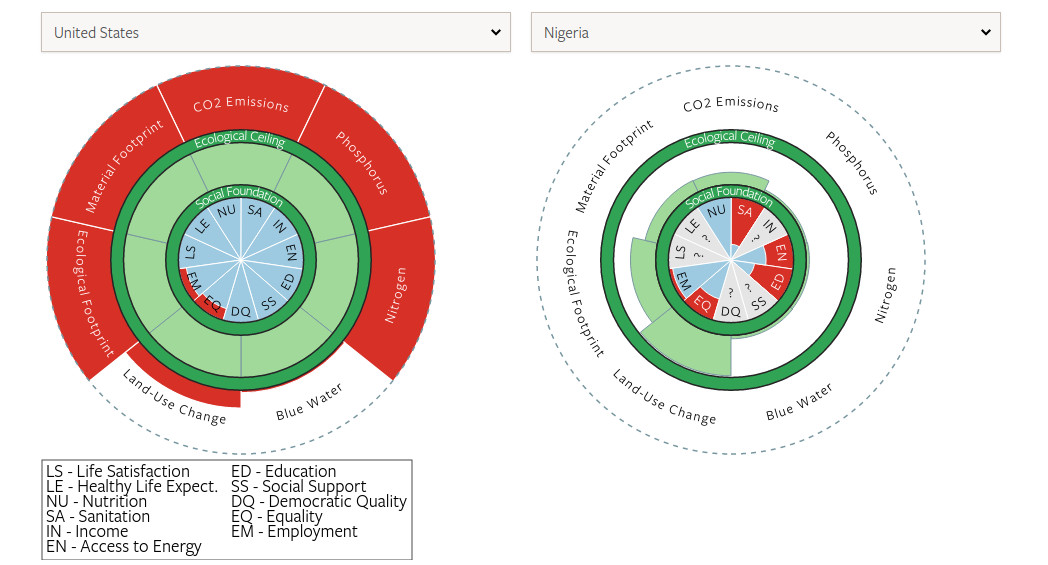 Blue wedges show social performance relative to a threshold associated with meeting basic needs. Green wedges show resource use relative to a biophysical boundary associated with sustainability. Red wedges show shortfalls below the social threshold or overshoot beyond the biophysical boundary, while grey wedges show indicators with missing data. Wedges with a dashed edge extend beyond the chart area. Ideally a country would have blue wedges that reach the social foundation and green wedges within the ecological ceiling. See the tables below for country-specific details.