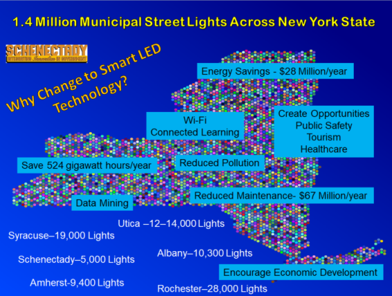 Many communities like the City of Schenectady are looking for opportunities to save energy and become more efficient in the services they supply to residents and businesses. Converting HID lighting to Wi-Fi and/or other communication enabled LED Smart Lighting will produce savings, improve maintenance, enhance public safety and public works, empower employees, and conserve natural resources. This technology also fosters innovation in government and the community. While one of the main objectives of this project is to reduce energy consumption, emerging technology allows the City and their partners to use this project as a platform for real change. Data will be collected and disseminated to users via Smart City platforms housed in city buildings, which will allow staff to make educated decisions in countless areas. A city-wide network will enable us to more fully integrate our facilities into the same network. Monitoring building operations as well as vacant properties will help reduce maintenance costs.