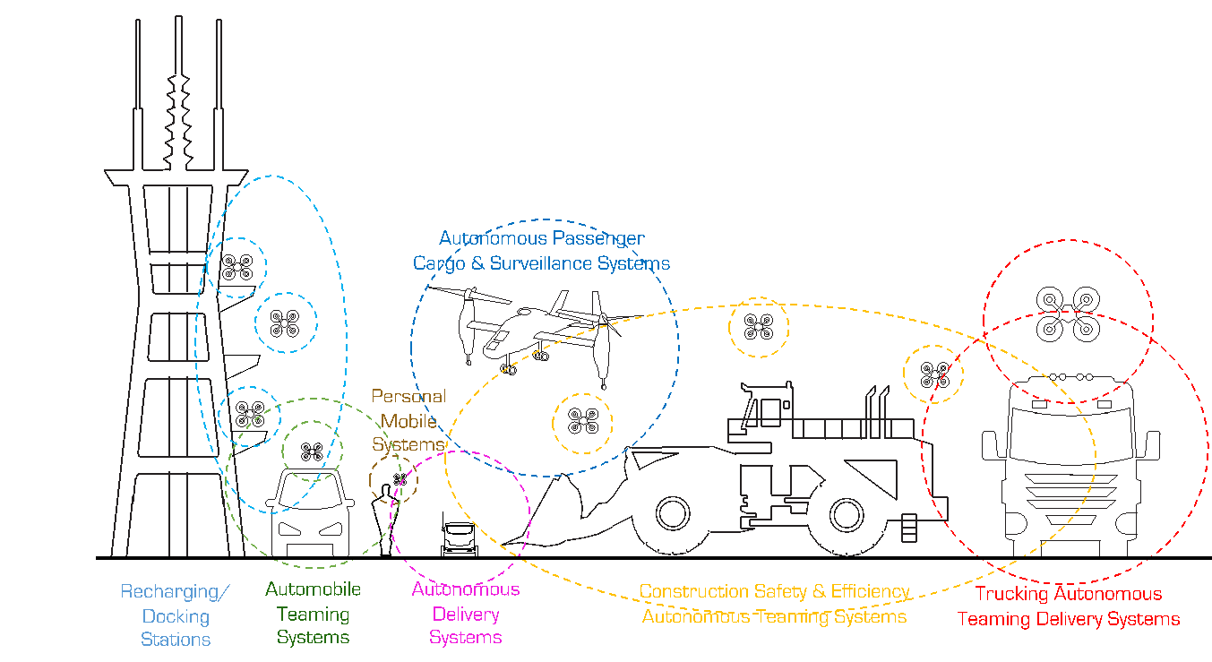 3. Coordinated, dynamic teaming systems in various custom configurations, swarms, and flock like assemblies;