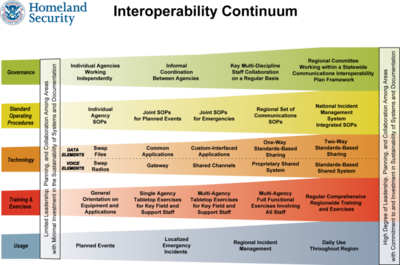 Optimal interoperability is contingent on an agency’s and jurisdiction’s needs. The Interoperability Continuum is designed as a guide for jurisdictions pursuing a new interoperability solution based on changing needs or additional resources. One important factor to note about the continuum is that while organizations mature accordingly from left to right in each stream, for many agencies the third level in any given stream could be its desired end-state.