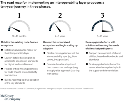 Given the complexity of the global trade finance market, a comprehensive effort to reconceive the ecosystem could easily take five to ten years to reach a point at which most participants reap its full benefits. However, some building blocks of an interoperability layer could be deployed on an accelerated path, leveraging the work already done by trade organizations, technology providers, and others. A strong commitment, particularly from banks, should deliver tangible benefits in two to three years and build momentum for the remaining initiatives.
