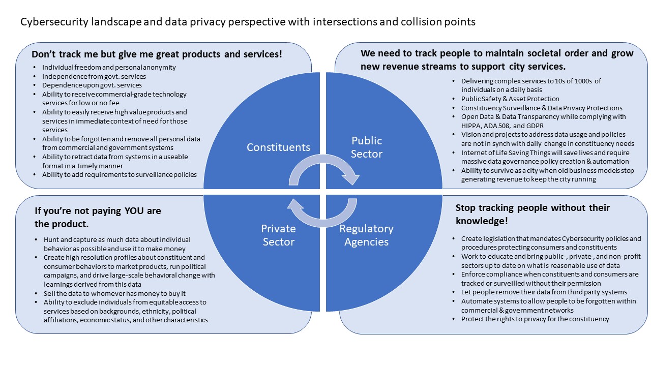 The Cybersecurity landscape and data privacy perspectives will showcase intersections and collision points where agenda is so different data privacy can become a show-stopper for Smart City projects. Our framework provides a way to keep the project moving by socializing varying agenda so all sides understand the benefits that come from defining new ways to share and secure data.