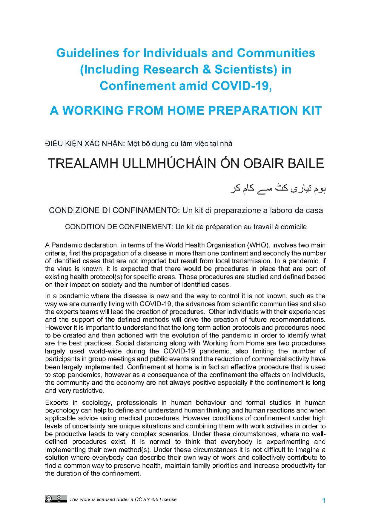 Experts in sociology, professionals in human behaviour and formal studies in human psychology can help to define and understand human thinking and human reactions and when applicable advice using medical procedures. However conditions of confinement under high levels of uncertainty are unique situations and combining them with work activities in order to be productive leads to very complex scenarios. Under these circumstances, where no well-defined procedures exist, it is normal to think that everybody is experimenting and implementing their own method(s). Under these circumstances it is not difficult to imagine a solution where everybody can describe their own way of work and collectively contribute to find a common way to preserve health, maintain family priorities and increase productivity for the duration of the confinement.